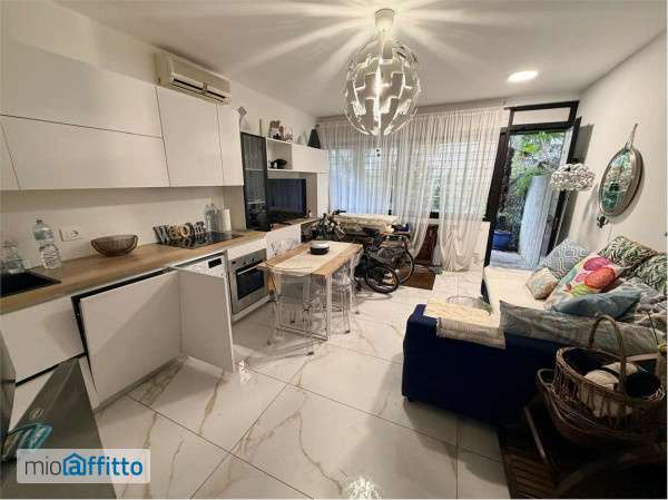 Affittiamo un appartamento con ingresso indipendente e giardino privato con portico esterno, composto da: soggiorno, pranzo con angolo cottura e bagno al piano principale; al piano sottostante (collegato da scala a chiocciola) si trovano una camera da letto, un piccolo vano con divano letto e un secondo bagno. Completa la proprietà un posto auto esclusivo in cortile condominiale. Richiesta: Giugno € 2. 000 - Luglio € 4. 000 - Agosto