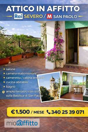 A pochi passi dalla Metro San Paolo, in vicolo tranquillo e silenzioso, proponiamo in affitto attico arredato situato al quarto piano con ascensore, con ampio terrazzo e vista sulla Basilica di San Paolo. L’appartamento, molto luminoso grazie all’ottima esposizione, è composto da: • salone • camera da letto matrimoniale • cameretta cabina armadio • cucina abitabile • bagno • grande terrazzo vivibile l’immobile è dotato di riscaldamento autonomo ed è arredato con elettrodomestici. Clausole contrattuali: - Locazione 3+2 anni - Fideiussione bancaria a prima richiesta - Deposito cauzionale 2 mensilità