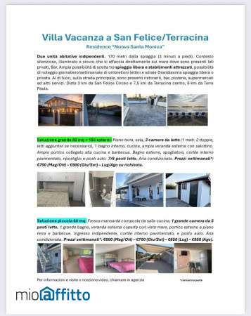 San Felice - Terracina, Residence “nuova Santa Monica” Dista 170 metri dalla spiaggia (3 minuti a piedi). Mansarda al piano primo composto da: sala-cucina, 1 grande camera da letto 4-5 posti letto, 1 grande bagno, veranda esterna coperta con vista mare, portico esterno al piano terra e barbecue, cortile interno pavimentato, e posto auto. Aria condizionata. Prezzo a settimana comprensivo di consumi. Collocata in un contesto silenzioso ed illuminato che si affaccia direttamente sul mare dove sono presenti due lidi privati con Bar e possibilità di noleggio giornaliero settimanale mensile di ombrelloni lettini e sdraie. Grandissima spiaggia libera o privata. Subito al di fuori, sulla strada principale, sono presenti ristoranti, bar, pizzerie, supermercati ed altri servizi. Dista 3 km da San Felice Circeo e 7,5 km da Terracina centro, 9 km da Torre Paola. Certificazione energetica in fase di richiesta. Disponibilta' costo settimana esclusi consumi: maggio ed ottobre: € 600,00 giugno e settembre: € 700,00 luglio: € 850,00 agosto: € 950,00.
